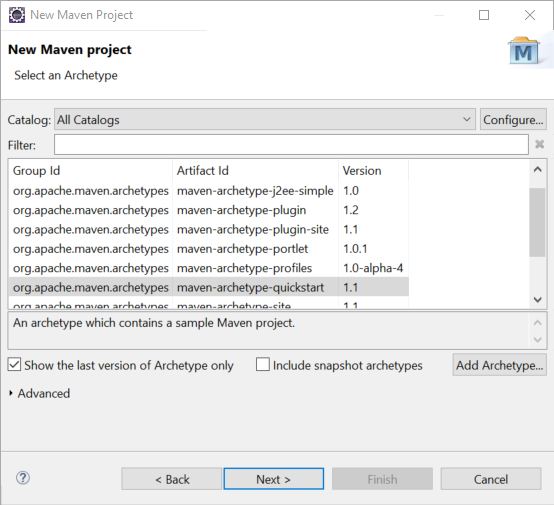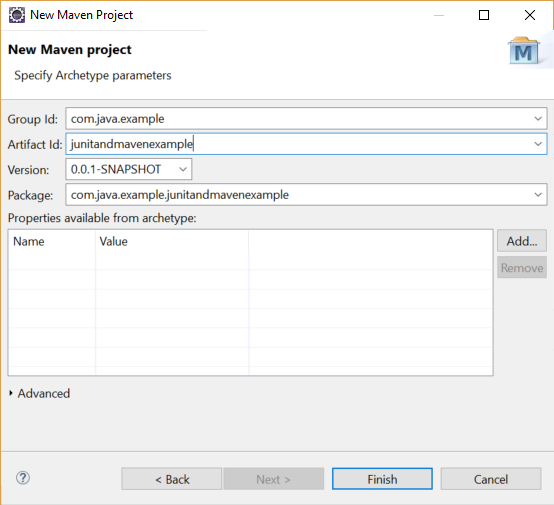 The Group Id and Artifact Id fields need to be completed. Then click on Finish
